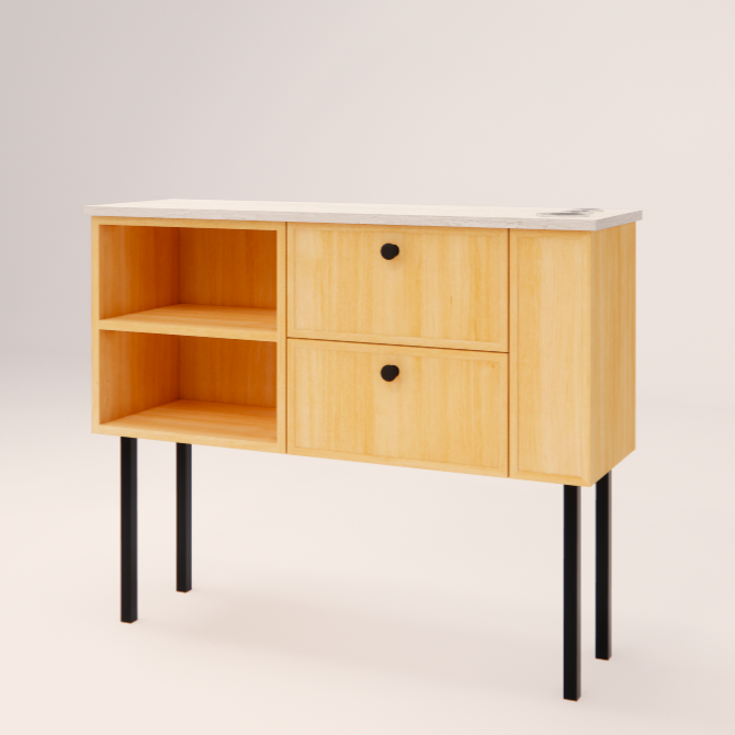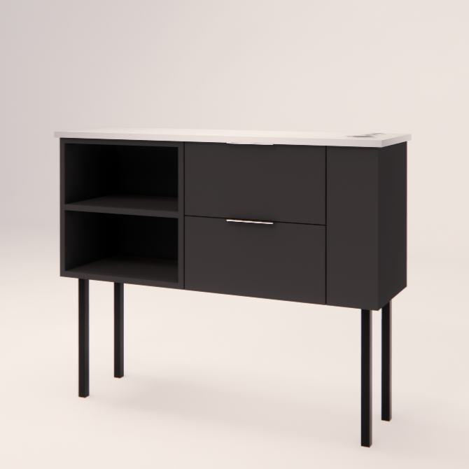 The Vanity Styling Station is designed to provide organized, accessible storage within a compact footprint. Its clean profile and elevated black metal legs create a modern look suited for professional salon environments.