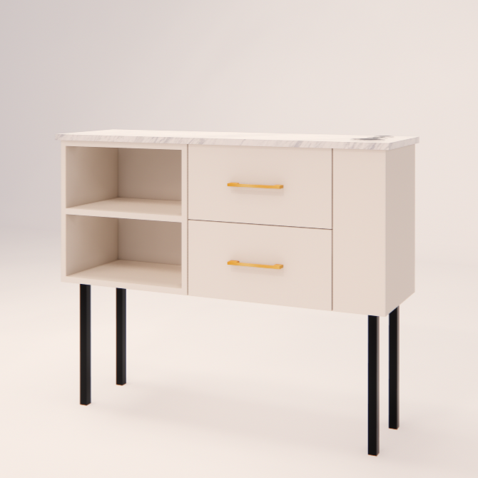 The layout includes two open shelves for frequently used products and tools, along with two drawers for concealed storage. Three integrated tool holder grommets allow for organized placement of styling tools while keeping the work surface clear and efficient.